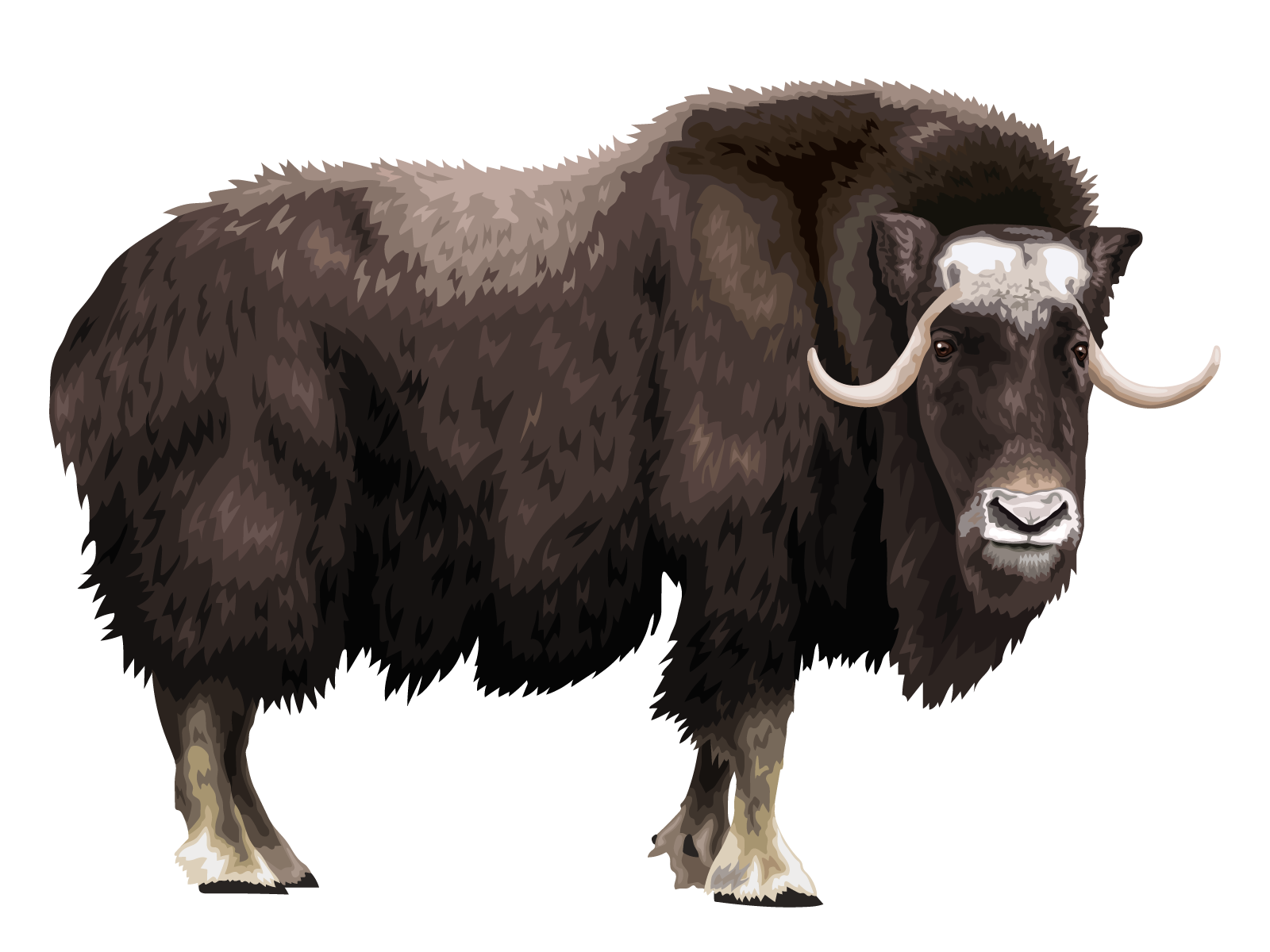 The muskox (Ovibos moschatus) is a large, cold-adapted mammal native to the Arctic regions of North America and Greenland. Known for its long, shaggy coat and curved horns, the muskox thrives in tundra environments where it grazes on grasses, lichens, and mosses. Adult bulls can weigh between 500 to 800 pounds, with thick horns used for defense and dominance displays.